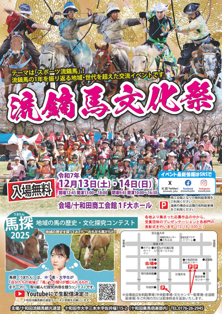 | 第17回桜流鏑馬 | 4月24日(土)~4月25日(日) 10:00~14:00 | 中央公園緑地 | 十和田流鏑馬観光連盟 (十和田乗馬倶楽部内) TEL 0176-26-2945 |