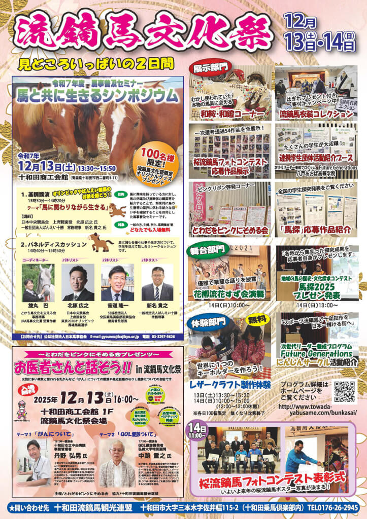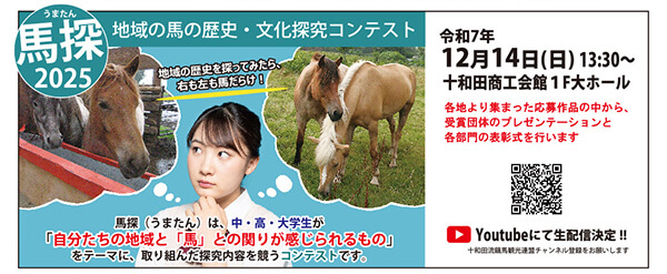 その他、展示や踊りの披露、体験コーナー、桜流鏑馬フォトコンテスト受賞者発表表彰式や、中・高・専門・大学生が「自分たちの地域と「馬」との関りが感じられるもの」をテーマに、取り組んだ探究内容を競うコンテスト「馬探」の受賞団体のプレゼンテーションと各部門の表彰式などが行われます。